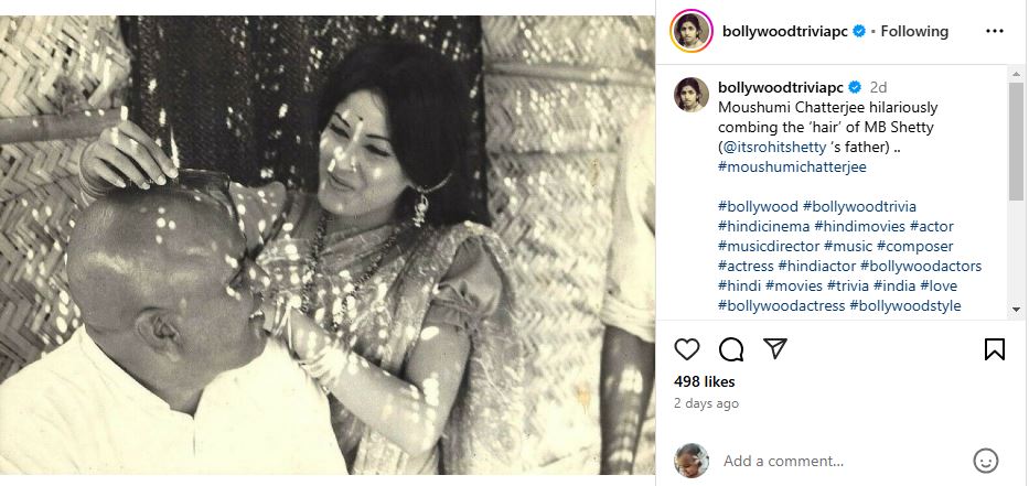 बॉलीवुड ट्रिविया पिक नाम के इंस्टाग्राम हैंडल ने ये मौसमी और बॉलीवुड के खूंखार विलेन एम बी शेट्टी की फोटो शेयर की है. सामने आई इस फोटो में मौसमी चटर्जी नजर आ रही हैं. जिनके एक हाथ में कंघी है. उस कंघी से वो अपने सामने बैठे शख्स के बाल बना ही हैं. लेकिन मजे की बात ये है कि इस फोटो में वह एम बी के बाल बना रही हैं, जबकि एम बी शेट्टी पूरी तरह गंजे हैं.