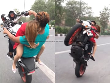 प्रेमी-प्रेमिका का एक वीडियो वायरल हो रहा है, जिसमें छोटी ड्रेस पहनी लड़की बाइक पर बॉयफ्रेंड के गोद में बैठ जाती है. लड़का उसे गले लगाकर तेज रफ्तार में बाइक चलाता है. लेकिन अब इन दोनों की तलाश में पुलिस जुट गई होगी.