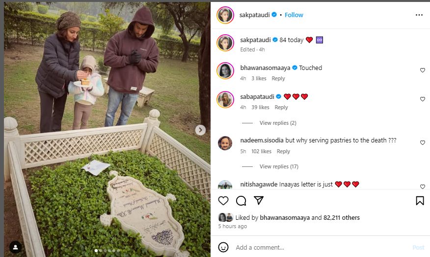 सोहा अली खान ने इन तस्वीरों को शेयर करते हुए लिखा, “आज 84 (84वीं बर्थ एनविर्सरी है आज).” सोहा की बेटी इनाया ने अपने नाना को याद करते हुए एक भावपूर्ण पत्र लिखा. पत्र में उन्हें जन्मदिन की शुभकामनाएं देने के साथ एक खुशहाल नए साल की शुभकामनाओं के साथ मेरी क्रिसमस भी लिखा.