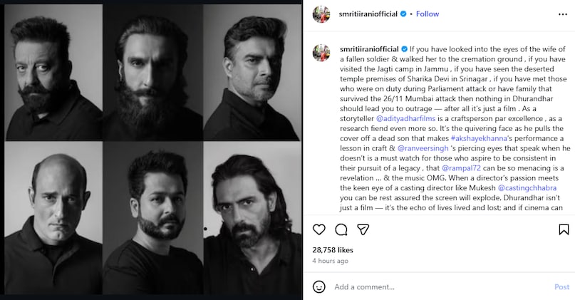 स्मृति ईरानी ने कास्टिंग निर्देशक मुकेश छाबड़ा की भी तारीफ की और कहा कि जब आदित्य धर जैसा जुनूनी निर्देशक और मुकेश छाबड़ा जैसी नजर मिलती है, तो परदे पर धमाका होना तय है. आर. माधवन के अजीत डोभाल वाले किरदार पर उन्होंने लिखा, “जिन्होंने असल में अजीत डोभाल को करीब से देखा है, उन्हें शुरू में थोड़ा अजीब लग सकता है, लेकिन सच ये है कि इस रोल के लिए माधवन से बेहतर कोई नहीं कर सकता था. बाहर से शांत, अंदर तूफान, बिल्कुल वैसा ही.”