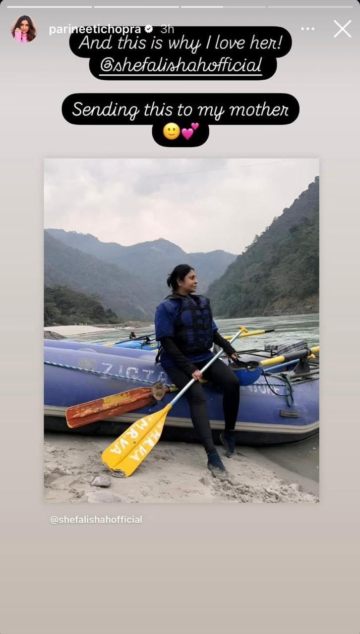 परिणीति चोपड़ा ने शेफाली शाह की पोस्ट शेयर की, जिसमें रिवर राफ्टिंग के बाद वह पोज दे रही हैं. परिणीति ने तस्वीर शेयर करते हुए लिखा,”इसी वजह से मैं आपसे प्यार करती हूं. इसे अपनी मां को भेज रही हूं. दरअसल, शेफाली शाह ने लास्ट इंस्टाग्राम पर रिवर राफ्टिंग के बाद की अपनी एक तस्वीर शेयर की और इस सोलो ट्रिप पर नोट लिखा.
