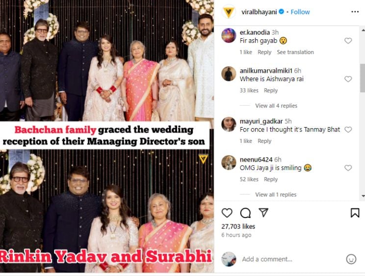 पैपराजी विरल भयानी जो तस्वीर शेयर की है, उस पर फैंस ने कमेंट कर ऐश्वर्या राय के बारे में पूछ रहे हैं. एक यूजर ने लिखा,”फिर ऐश गायब है.” एक अन्य यूजर ने लिखा, “ऐश्वर्या राय कहां हैं?” वहीं, कुछ लोगों ने जया बच्चन को हंसता देख हैरान जताई. एक यूजर ने लिखा, “ओएमजी, जया जी हंस रही हैं.” दअरसल, जया को अक्सर पैपराजी पर गुस्सा होते हुए या और रुड होते देखा गया है. वह बहुत कम मुस्कुराते हुए पोज देती हैं.