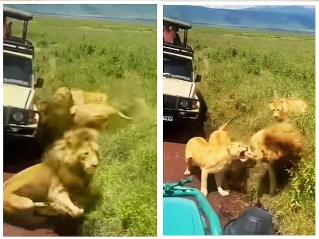 वीडियो में आप देखेंगे कि नज़ारा एक जंगल सफारी का है. वहां पर एक गाड़ी खड़ी हुई है, जिसके पास ही शेरनियां बैठी हैं. इतने में दो शेर आते हैं और उनकी तरफ जाने लगते हैं. शेरनियां न जाने किस बात पर भड़क जाती हैं और इतनी आक्रामक होकर आती हैं कि एक शेर तो वहीं से लौट जाता है, जबकि दूसरे शेर पर वे सारी शेरनियां मिलकर टूट पड़ती हैं. इन्हें ऐसा करते देख शेर किसी तरह अपनी जान बचाकर भागता है.