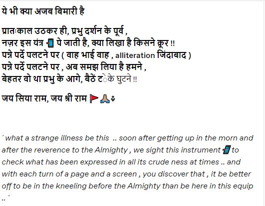 अमिताभ बच्चन ने आगे लिखा, “और एकांत का आनंद अब काम और दिनचर्या के आनंद में बदल गया है. दिनचर्या बुजुर्गों की विरासत बन गई है.” इसी ब्लॉग में उन्होंने लिखा, “ये भी क्या अजब बिमारी है. प्रातःकाल उठकर ही, प्रभु दर्शन के पूर्व, नज़र इस यंत्र मोबाइल पे जाती है, क्या लिखा है किसने क्रूर!! पन्ने पर्दे पलटने पर (वाह भाई वाह, alliteration जिंदाबाद ), पन्ने पर्दे पलटने पर , अब समझ लिया है हमने, बेहतर वो था प्रभु के आगे, बैठें टेके घुटने!! जय सिया राम, जय श्री राम.”