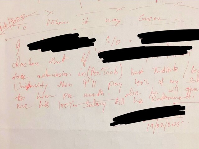 ऑनलाइन प्लेटफॉर्म रेडिट के r/JEENEETards नाम के हैंडल से 19 फरवरी को ये पोस्ट शेयर किया गया है. जिसके कैप्शन में लिखा गया है- ‘मेरे पापा ने एक ऐलान किया है.’ उन्होंने एक एग्रीमेंट में लिखा है कि अगर बेटा IIT, NIT, IIIT या BITSAT जैसे किसी टॉप कॉलेज में एडमिशन लेता है, तो वह अपनी सैलरी का 40% हर महीने रिटायरमेंट तक उसे देते रहेंगे. अगर वो किसी टियर-2 या टियर-3 कॉलेज में गया, तो फिर बेटे को अपनी 100% सैलरी जिंदगीभर पापा को देनी होगी.