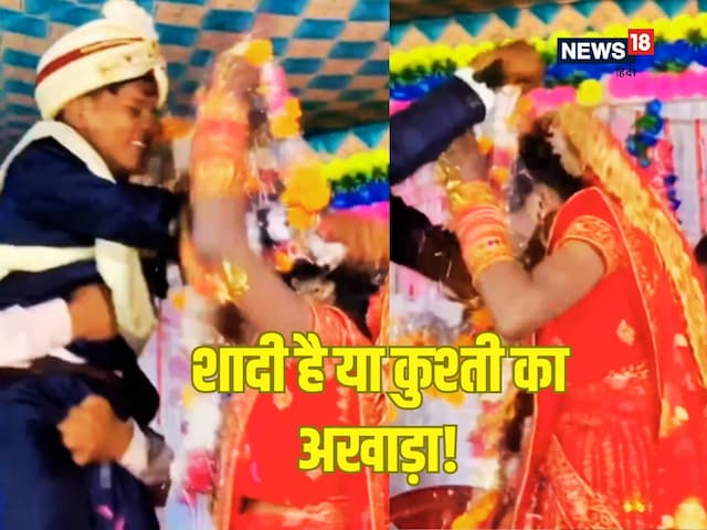 वायरल हो रहे वीडियो में देखा जा सकता है कि स्टेज पर ही दूल्हा-दुल्हन एक दूसरे से मारपीट करते नजर आ रहे हैं. जैसा कि आमतौर पर जयमाला की रस्म में होता है, दूल्हा और दुल्हन जैसे ही एक-दूसरे को माला पहनाने लगते हैं, उनमें से एक पीछे हटने लगता है. यहां पर मामला थोड़ा ज्यादा गरमा जाता है, जब दूल्हे को उसके दोस्त पीछे की ओर खींचने लगते हैं. एक दोस्त तो उसे ऊपर ही उठा देता है, जिस पर दुल्हन भी हार नहीं मानती है और वो कूद-कूदकर माला डालने लगती है. इसमें चल रही छीनाझपटी को देखकर कहीं से भी ये नहीं लग रहा कि ये शादी का स्टेज है.