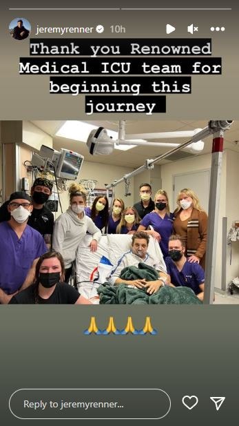 जेरेमी फोटो के साथ दिए कैप्शन में लिखते हैं, ‘इस जर्नी की शुरुआत के लिए फेमस स्टाफ का शक्रिया.’ वे फिलहाल अपनी चोटों से उबर रहे हैं. मीडिया रिपोर्ट के अनुसार, उन्हें 1 जनवरी को अस्पताल में भर्ती कराया गया था, जिसके अगले दिन उनकी सर्जरी हुई थी. एक्टर के फैंस उनके जल्दी ठीक होने की दुआ कर रहे हैं. जेरेमी ने मैसेज टाइप करने में मश्किल होने के बावजूद सोशल मीडिया पर आकर फैंस की प्रार्थनाओं के लिए शुक्रिया अदा किया था.